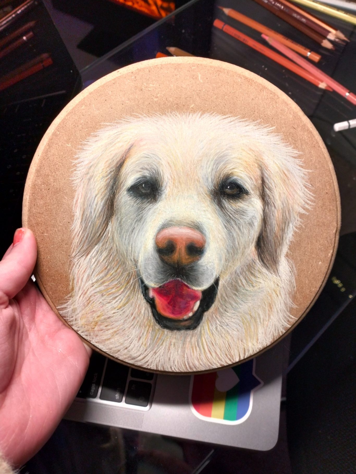 - Drawings made with coloured and/or graphite pencils on paper or MDF board